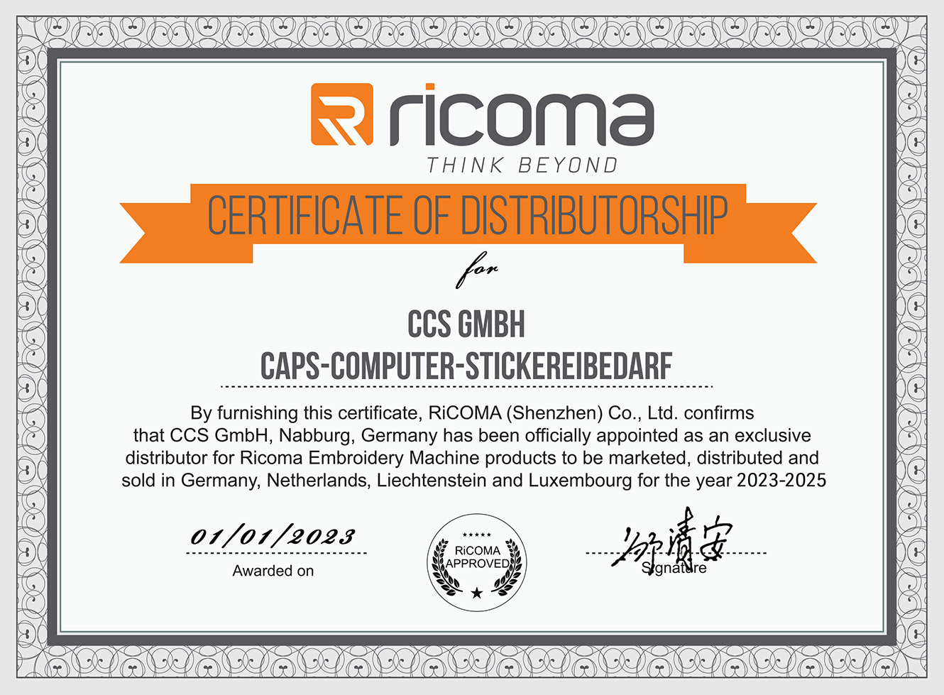 Unsere Maschinen stammen direkt, ohne jegliche Zwischenhändler, aus dem Hauptproduktionswerk von RiCOMA und werden mit Zustimmung des Firmenchefs Herrn Frank Ma in unser Hauptlager nach Deutschland importiert. Die CCS GmbH ist hierbei der exclusive Generalimporteur von RiCOMA Stickmaschinen in Deutschland, Österreich, Schweiz, Liechtenstein und Luxemburg.